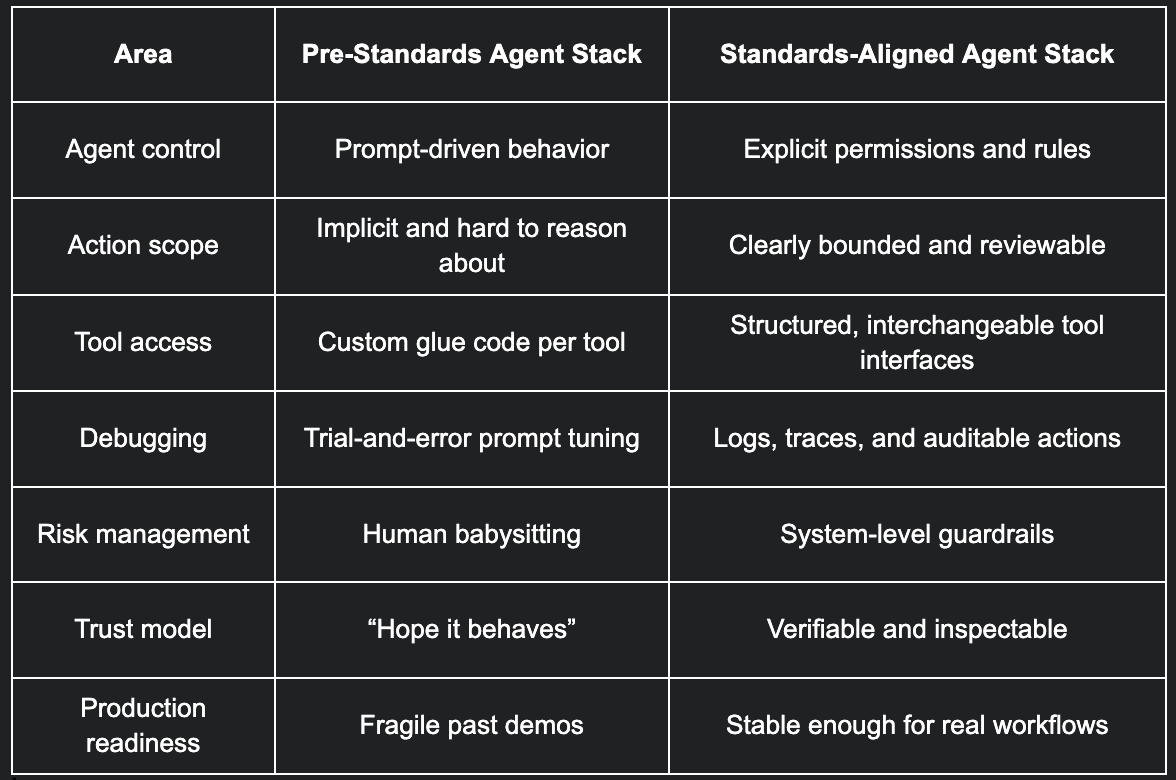 The first items to get standardized won’t be flashy. They’ll be the boring parts that make agents safe to run in production.
